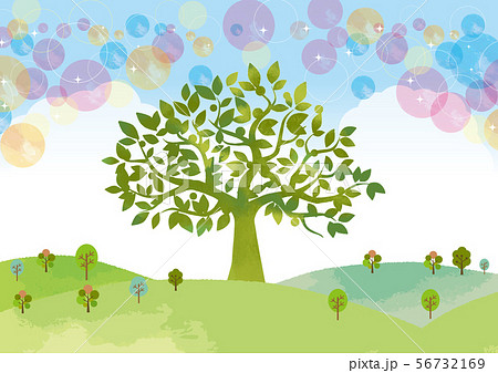 草原:丘 大地 緑 景色 青空 空 自然 背景 水彩 手描き 青空 空 大木 樹木 木