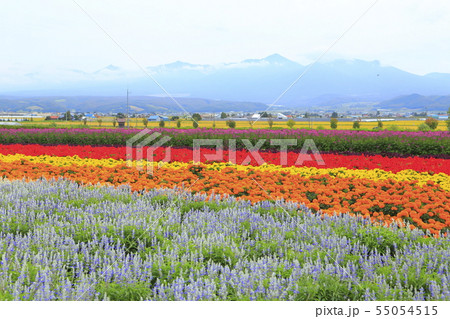 北海道空知郡中富良野町 なかふらの北星山ラベンダー園を見下ろす展望台からサルビア花畑越しの十勝岳連峰