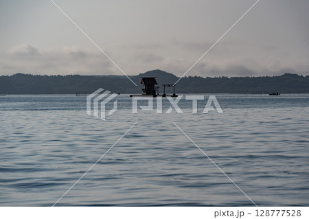 早朝の海の風景 コンブ漁の漁船 北海道浜中町
