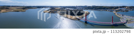 ドローン|パノラマ撮影|北潟湖に架かる赤色に輝くアイリスブリッジの空撮|福井県あわら市