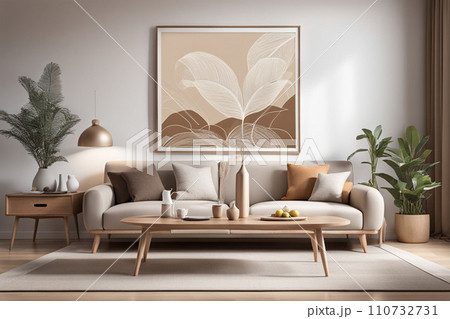 mock up poster frame in boho interior background, wooden living room design, Scandinavian style. Generative AI illustration