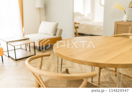 Blurred modern living room interior with stylish sofa and wooden lamp for captivating backgrounds.