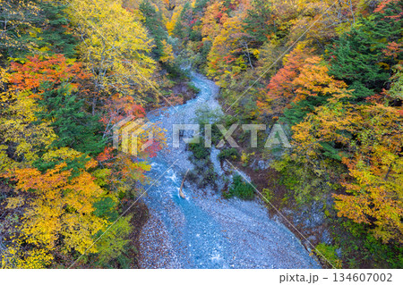 長野県大町市平高瀬入 高瀬渓谷北葛沢の川岸の色とりどりの紅葉