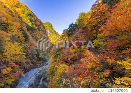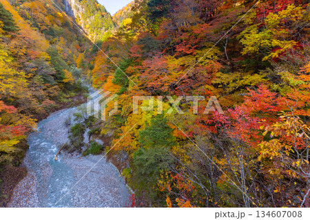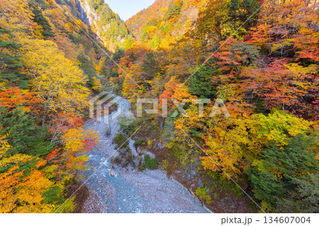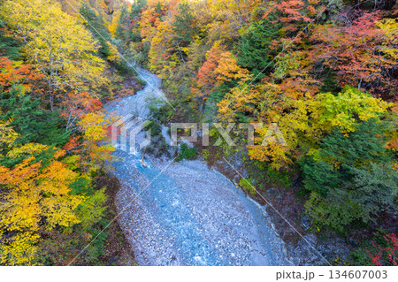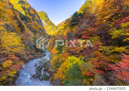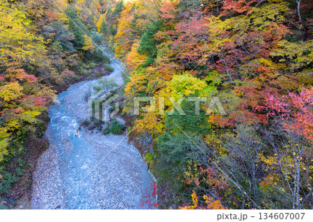 長野県大町市平 高瀬渓谷北葛沢の鮮やかなエメラルドグリーンの川面と川岸の紅葉