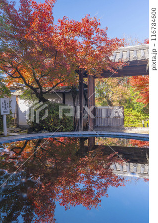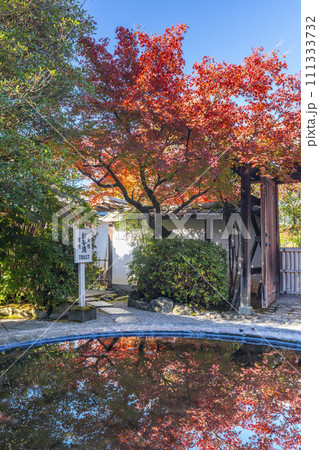 秋の京都 曼殊院 北通用門 水鉢に映る逆さ紅葉