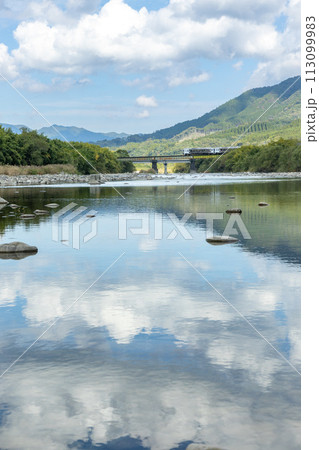 青空と新緑と川に姿を写しながら架かる鉄橋を渡る日南線特急「海幸山幸」