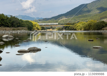 紅葉した大木と広渡川に架かる鉄橋を渡る日南線特急「海幸山幸」