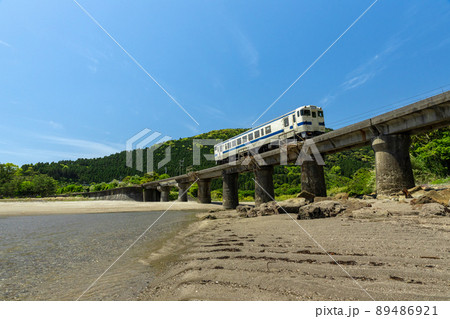 日南海岸の快晴で青空が広がる宮崎県日南市山王の隈谷川橋梁を走るJR九州ローカル線日南線キハ40