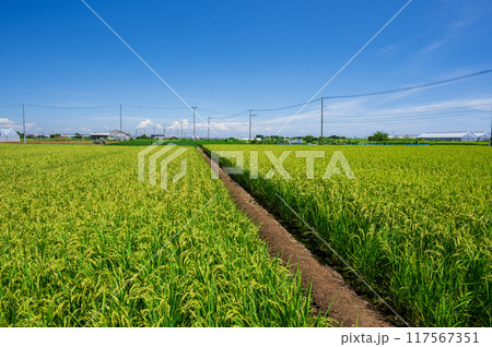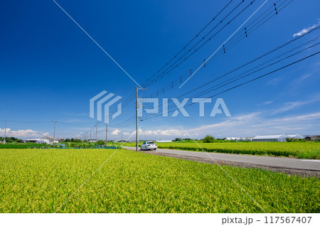 送電線が走る美しい田園風景 青空と田んぼ
