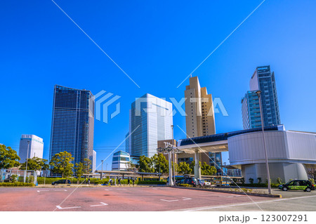 日本の東京都市景観 桜木町駅前。エアキャビンの桜木町駅や横浜市役所などを望む