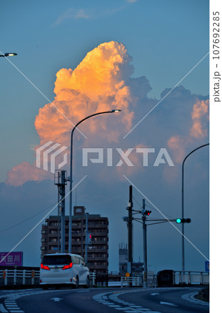 《愛知県》名古屋市北区国道19号の上空に現れた夕日に照らされる積乱雲