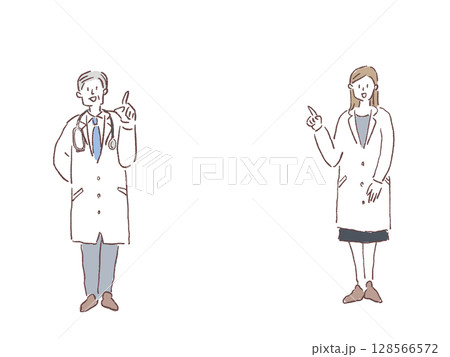 上を指差す白衣を着た医師(シニア男性、若い女医)