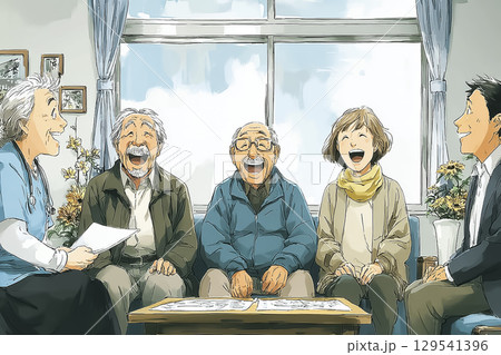 シニア向けグループフィットネスクラスで元気に体を動かす高齢者の笑顔イラスト