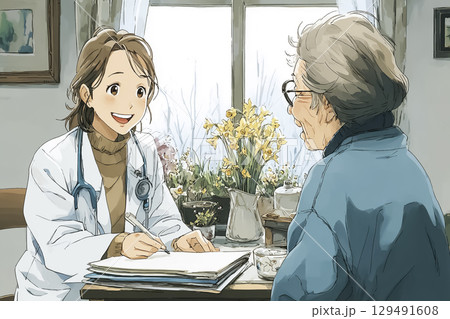冬の訪問医療シーン冬の在宅医療・訪問診療を受ける高齢男性と医師の交流シーン