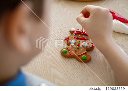 Merry Christmas and Happy Holidays. Boy cooking Christmas gingerman cookies.
