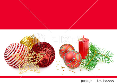 Red candles and fir branches and Christmas balls in snow isolated on white. There is free space for text. Collage.