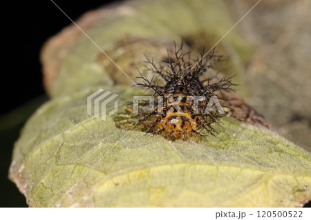 生き物 昆虫 トホシテントウ、幼虫です。長細い俵型に枝分かれしたトゲトゲが沢山