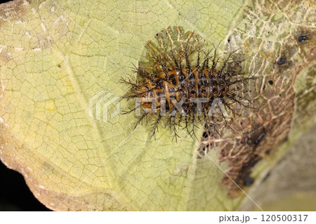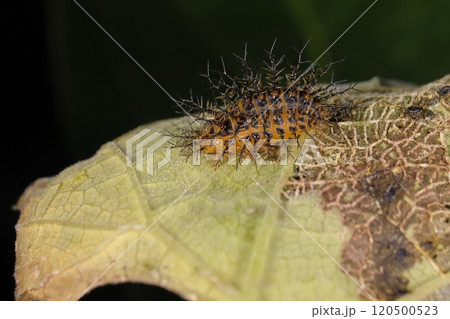 生き物 昆虫 トホシテントウ、幼虫です。十一月、カラスウリのしなびた葉の上で