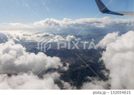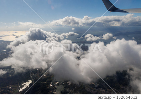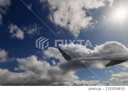 飛行機の窓の外に見える晴天と白い雲
