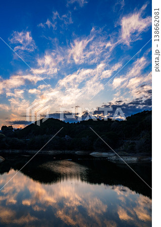 夕焼け空を黄金色に染めながら布目湖対岸の山並みに沈んで行く夕日 黄金色に染まる千切れ雲と紺碧の空