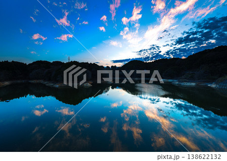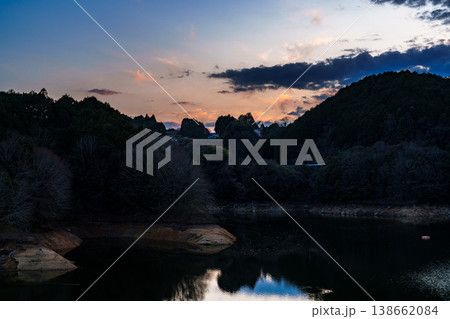 2026布目ダムの春 刻々と変化する空と湖面 山際の残照と美しいブルーモーメントの空