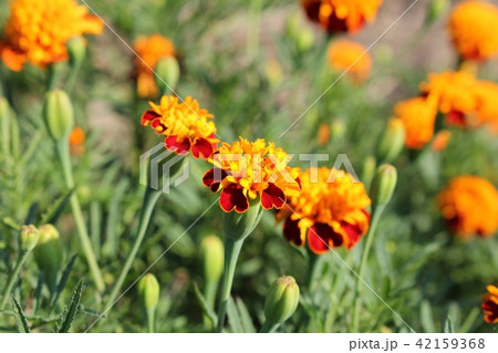 初夏の庭に咲くマリーゴールドの花