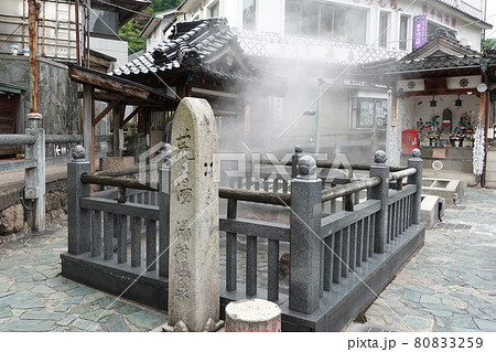 山陰の名湯「湯村温泉」の朝 熱湯源泉荒湯の湯けむりと慈覚大師座像