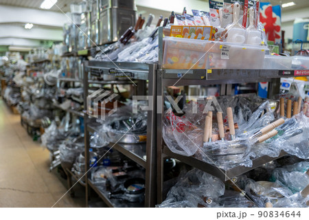 業務用の様々なサイズの鍋を売っている店の風景
