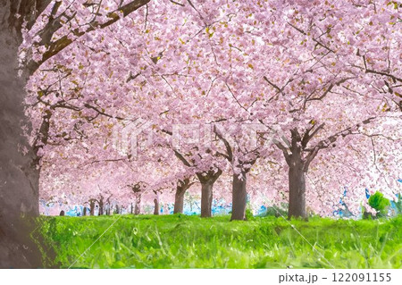 【水彩画】千曲川桜堤の桜並木 八重桜【長野県】