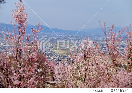 満開の啓翁桜の花越しの春の善光寺平遠望
