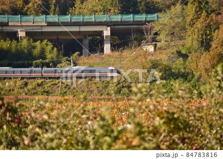 荏沢川石堰堤施設の最下流のJR篠ノ井線を走行する四季島