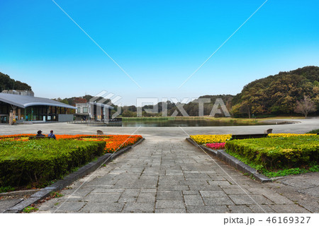 21世紀の森と広場 千駄堀池と花壇とカフェテラス