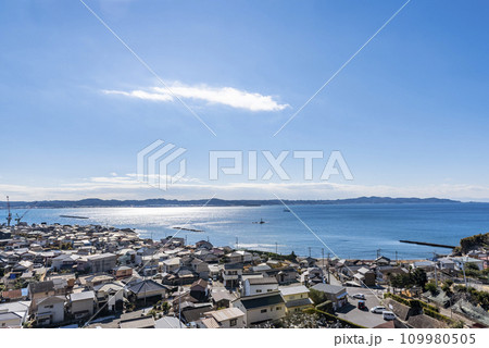 千葉県館山市の大福寺 崖観音の観音堂の石段上からの眺望(館山市船形,鏡ヶ浦,館山湾など)