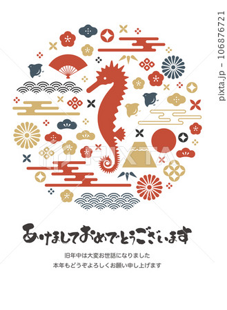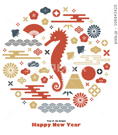 辰年の年賀状テンプレート ベクター 和 円形配置 タツノオトシゴ 年賀2024