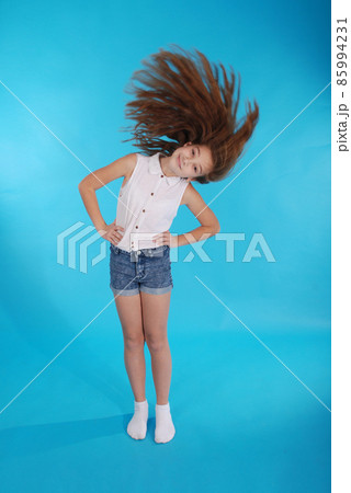 Beautiful little girl in casual clothes jumping isolated on white studio background. Happy childhood concept.