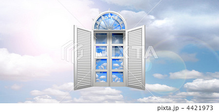 半円窓 観音開きの洋風窓 正面 CG 窓の中の雲 逆光 左上 青空背景 横長画面