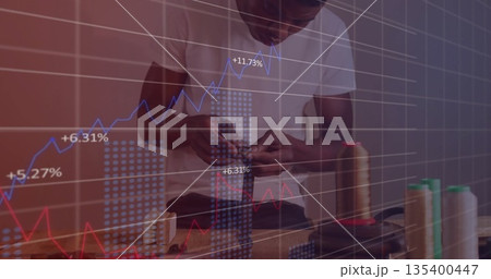 Threading needle tailor wearing T-shirt working on bench in workshop with spools, financial charts