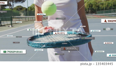 Balancing tennis ball woman in white sportswear holding racket on blue court, with floating icons