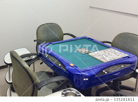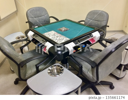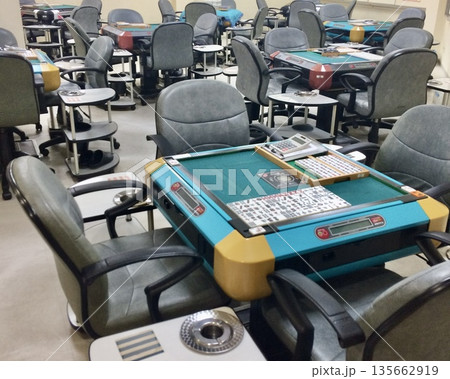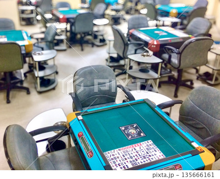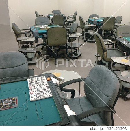 麻雀卓がたくさん並んだ、日本の雀荘の店内風景