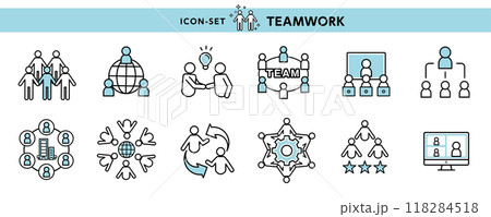 仕事や学校で…チームワーク、ネットワークなどのアイコン・ピクトのデザイン素材セット