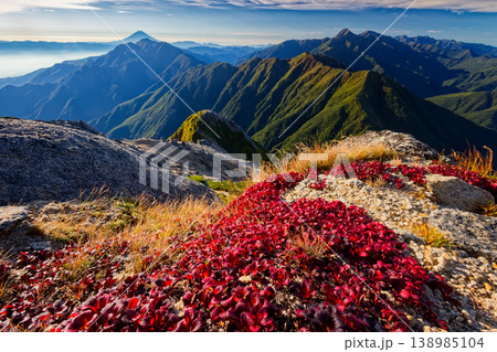 甲斐駒ヶ岳山頂のウラシマツツジの紅葉と富士山・鳳凰山の眺め