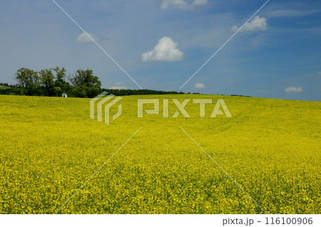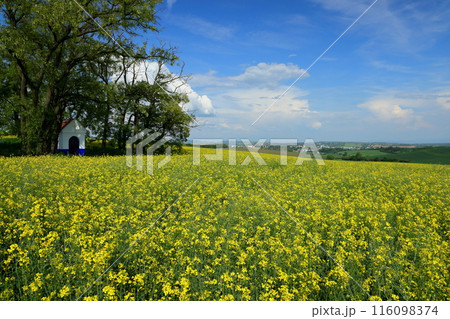 中欧のチェコ共和国 南モラヴィア州キヨフ近くの菜の花畑に小さなチャペルが建つモラヴィア大草原の景色