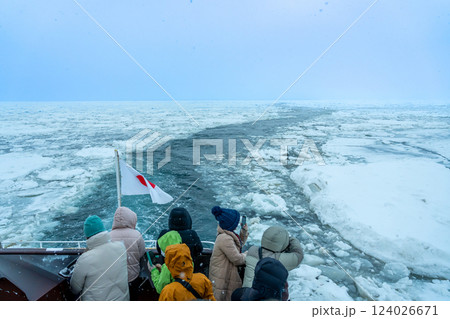北海道網走市 雪の降る中、流氷観光砕氷船のおーろら号で流氷を見る観光客