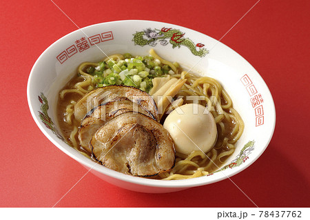 炙りチャーシューや味玉、メンマや万能葱が入ってる豚骨醤油ラーメンを赤色の背景で撮影