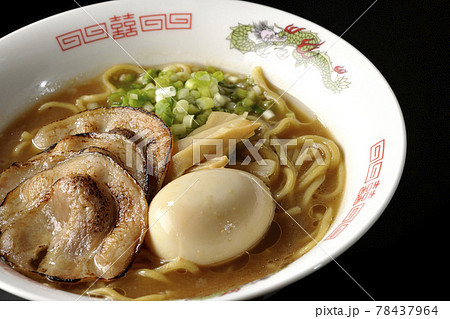 炙りチャーシューや味玉、メンマや万能葱が入ってる豚骨醤油ラーメンを白背景で撮影