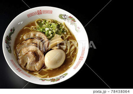 炙りチャーシューや味玉、メンマや万能葱が入ってる豚骨醤油ラーメンを黒背景で俯瞰撮影