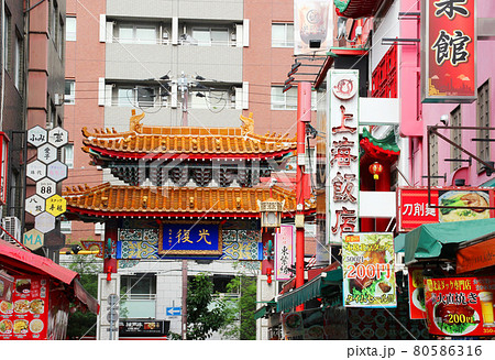 春節祭の神戸南京街 南京東路の長安門を南京東路内側から見上げる風景 神戸市中央区