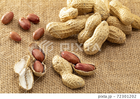 麻布の上に置いた殻付きの落花生