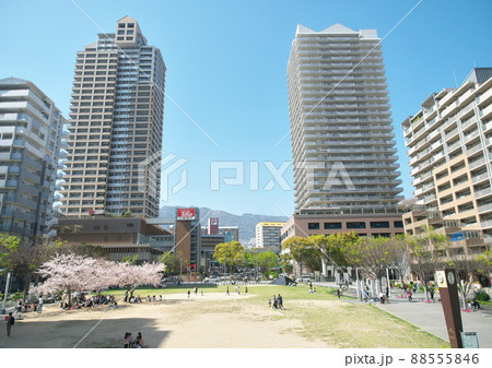 休日の昼下がり 桜咲く六甲道南公園と高層マンション群