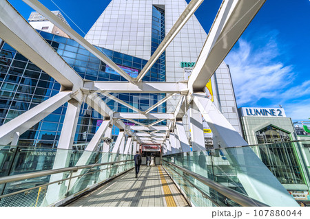 日本の東京都市景観 新宿駅前・新宿高島屋(渋谷区千駄ケ谷)側からNTTドコモ代々木ビルや電車など